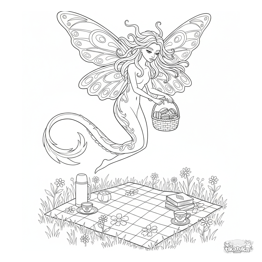 Complex art-nouveau style coloring page for kids 10-12: an elegant winged monster delivers a basket of macarons to a picnic. Detailed lines and patterns.