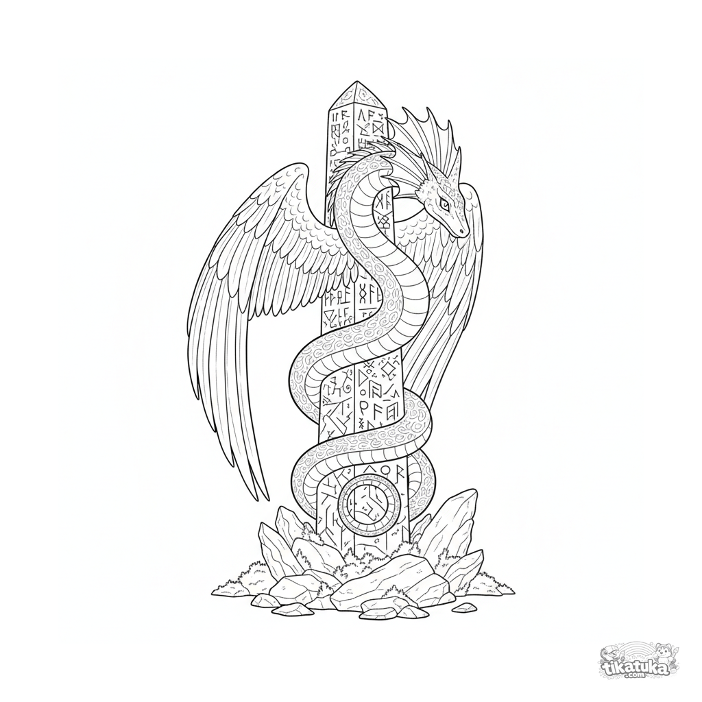 Detailed coloring page for older kids 10-12: an intricate winged serpent guardian coils around an ancient runic monolith. Many lines, textures, historical atmosphere.