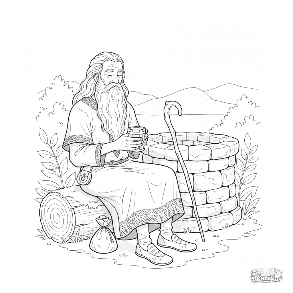 Coloring page for older kids 10-12: a wise elder rests by an ancient living well. A detailed scene for coloring with peaceful, contemplative tones.