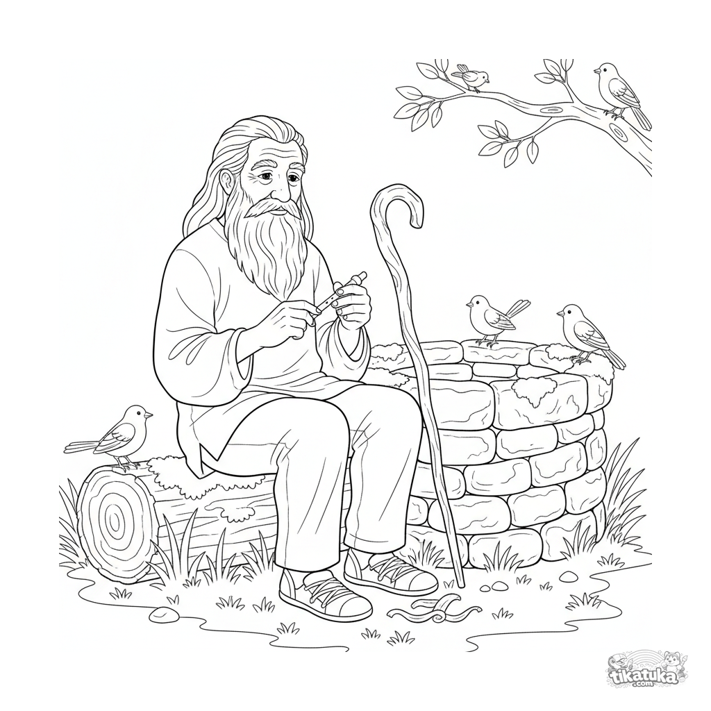 Detailed coloring page for ages 10-12: a wise elder rests by the well of living water, whittling a whistle. Intricate line work, realistic forms.