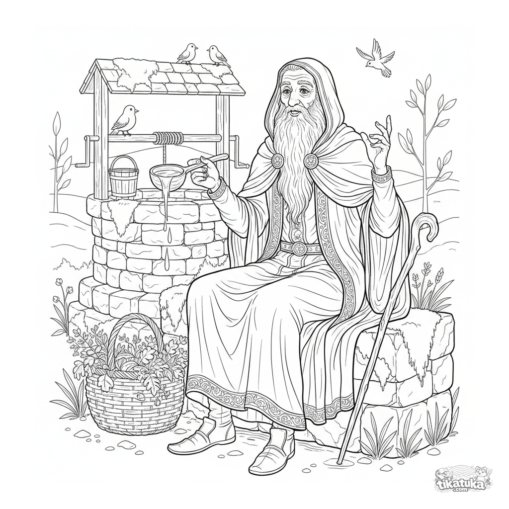 Coloring page for older kids 10-12: a wise storyteller at a well with living water. Detailed engraving style, scene centered with wide margins.