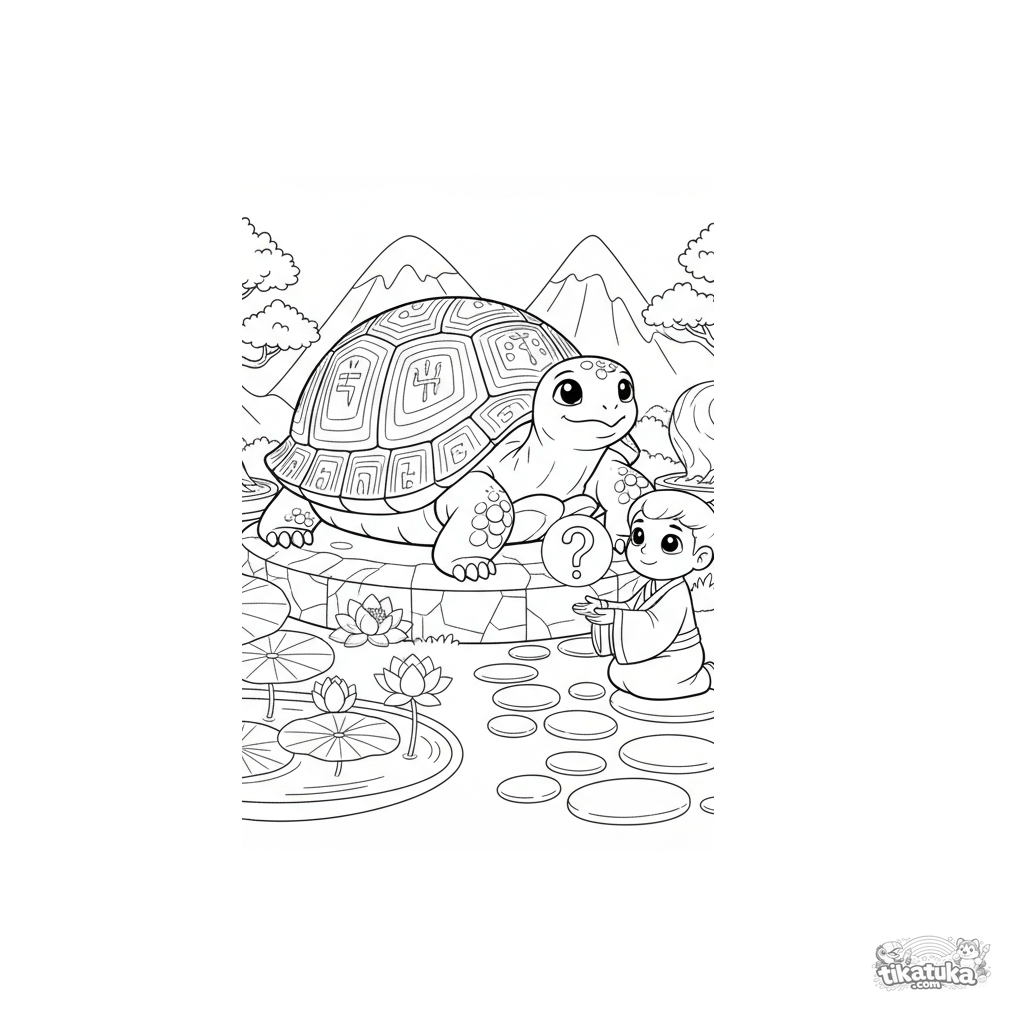 Older kids coloring page: a wise tortoise oracle gives advice to an acolyte in a mountain temple garden. A detailed riddle scene from myths.