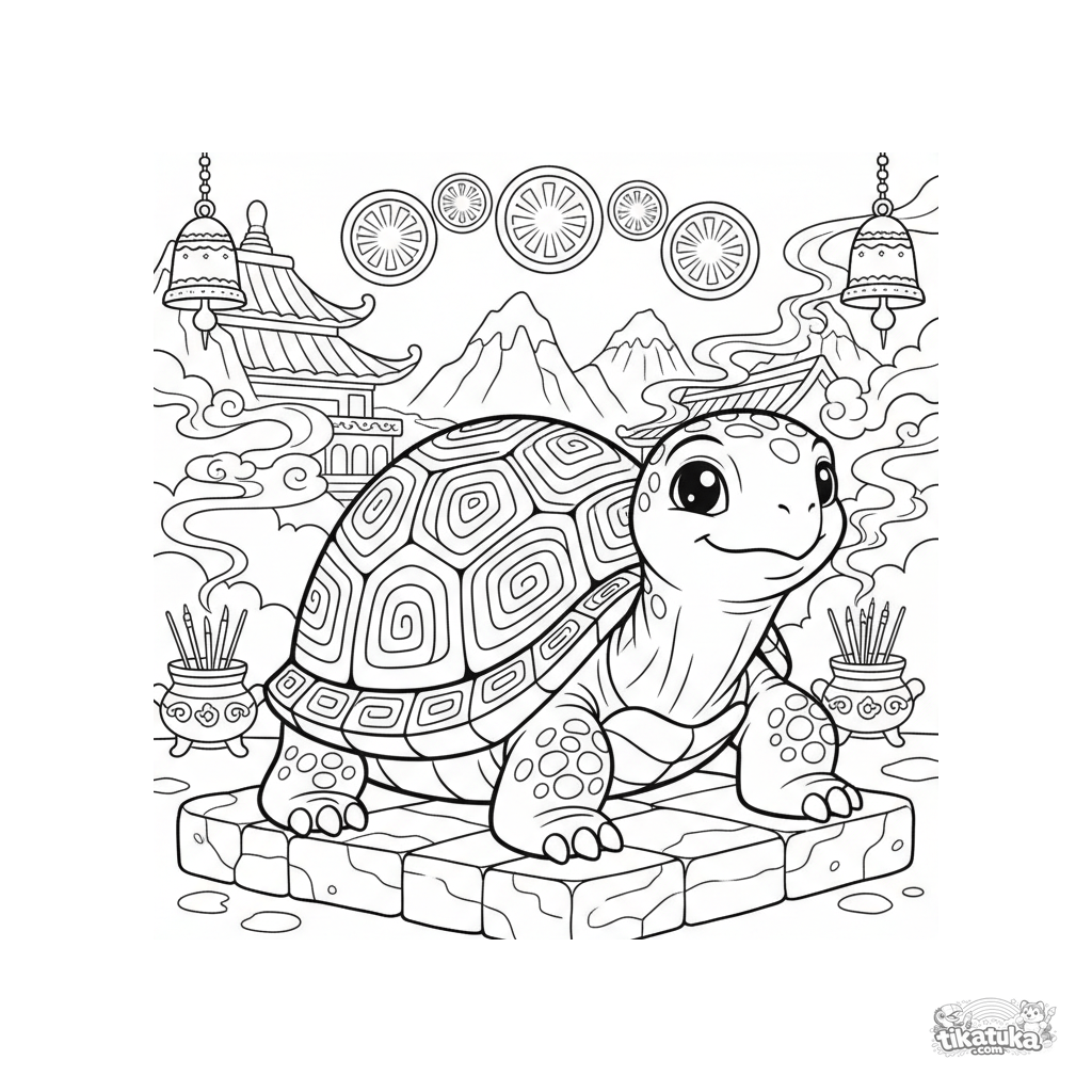 Kids coloring page: a wise ancient turtle sits in a mountain temple, meeting gods represented as glowing orbs, with incense burners and bells around.