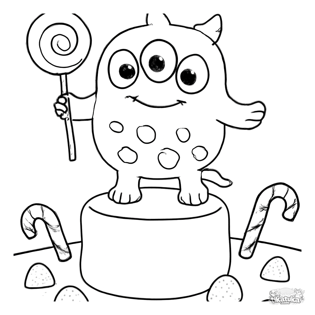Coloring page of a cute three-eyed monster balancing on a marshmallow in a candy meadow. An easy picture for toddlers ages 2-5 with wide margins for coloring.