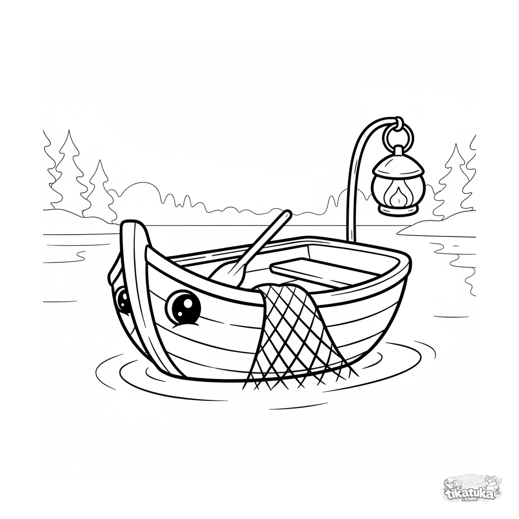 Toddler coloring page: a simple wooden fishing boat on a calm, foggy lake. Large shapes, minimal detail, perfect for first crayons.