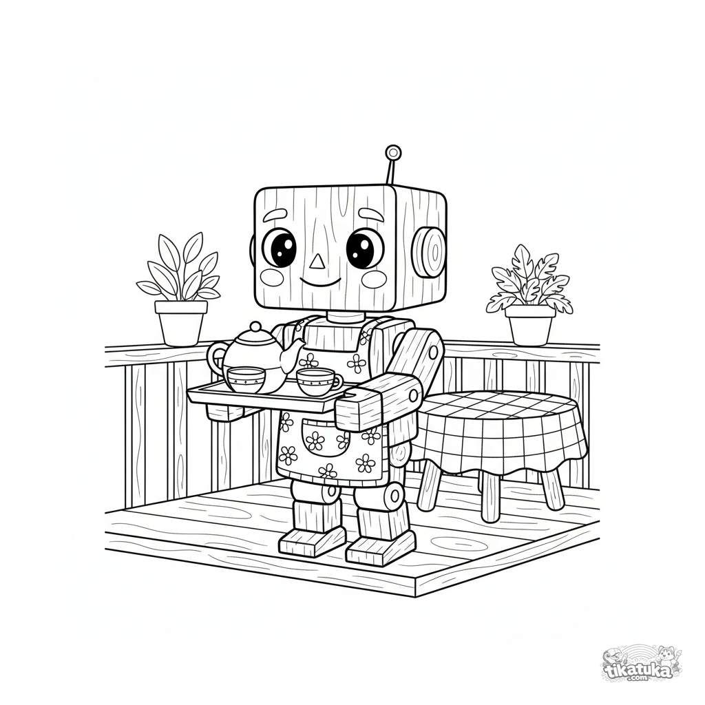 Coloring page for tweens 7-9: a friendly wooden toy robot serves tea on a tray on a cottage veranda. Whimsical and cozy scene in a wooden toy style.