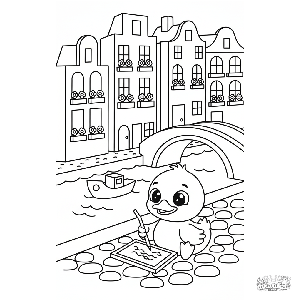 Toddler coloring page 2-3: a cozy canal street with houses, a duckling drawing with chalk. Large simple shapes like a wooden toy, very wide margins for coloring.