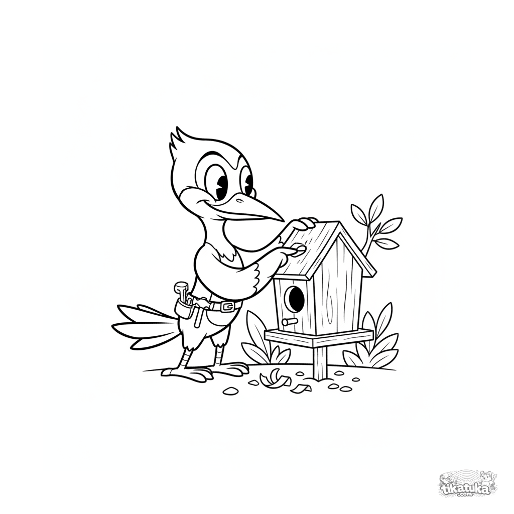 Coloring page for tweens 7-9: a woodpecker in a retro style inspecting the quality of a newly built wooden birdhouse. It has a tool belt. A dynamic and funny scene.