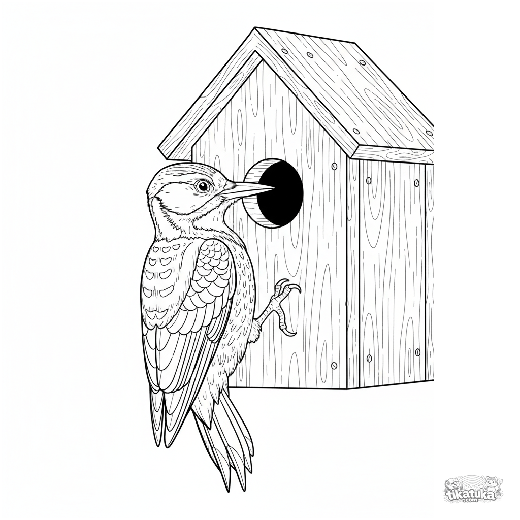 Detailed coloring page for kids 10-12: a spotted woodpecker clings to the front of a wooden birdhouse, intently studying the entrance hole. Realistic wood and feather textures.