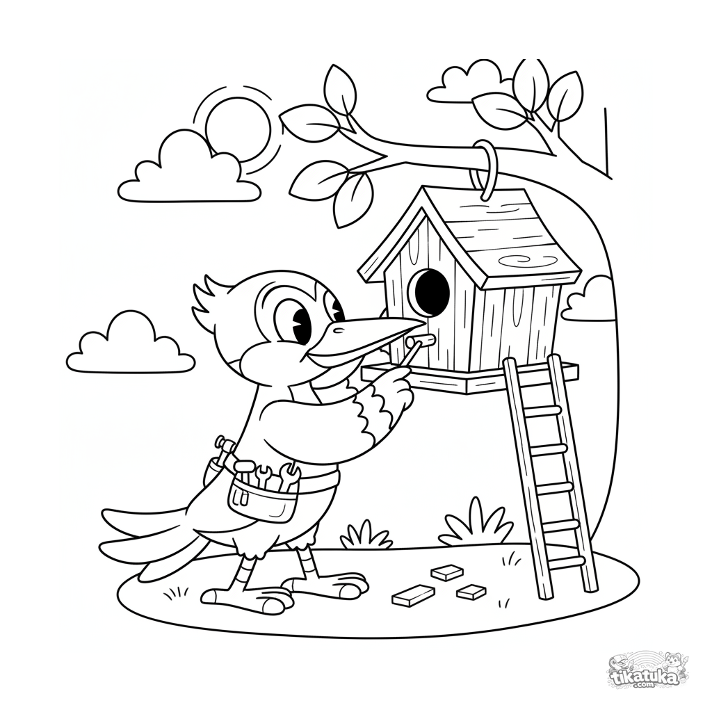 Coloring page for kids 4-6: a cheerful retro-style woodpecker inspects a wooden birdhouse. Wearing a tool belt, with a ladder nearby. Fun scene for coloring.
