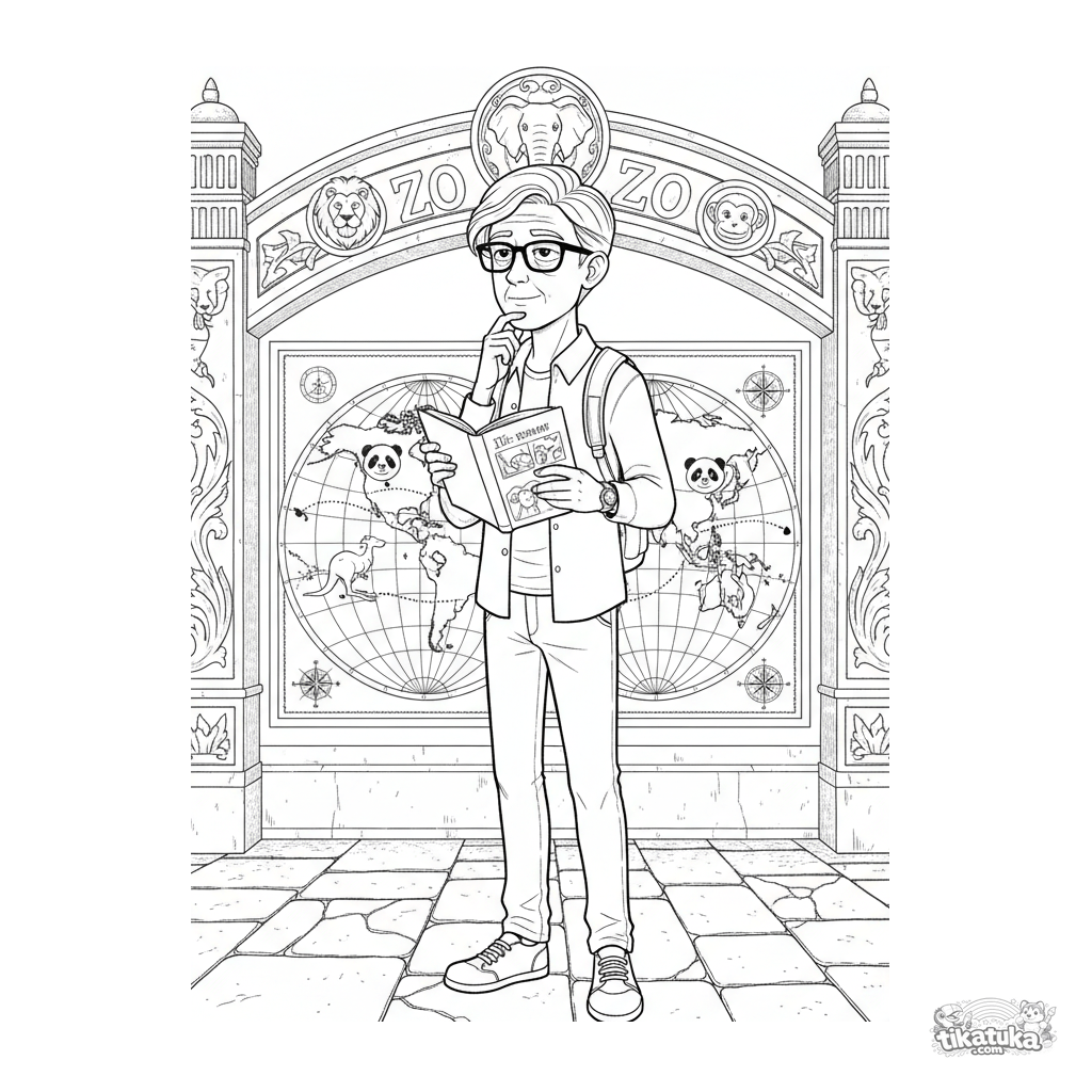 Coloring page for kids 10-12: a student studies a world map at the zoo entrance showing where different animals originate. Educational geography scene.