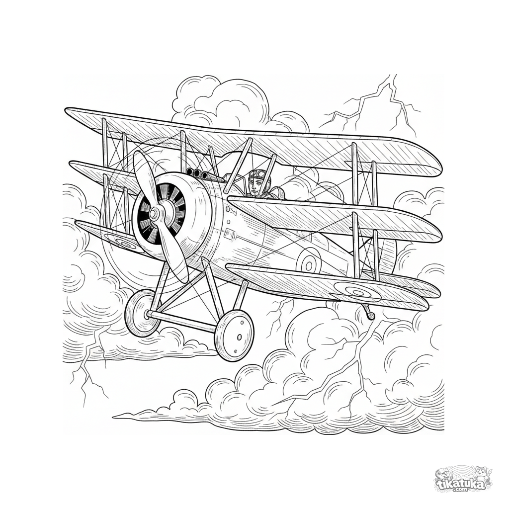 Detailed coloring page of a WWI triplane performing a loop in a stormy sky. For older kids 10-12. Vintage engraving style with lots of details.