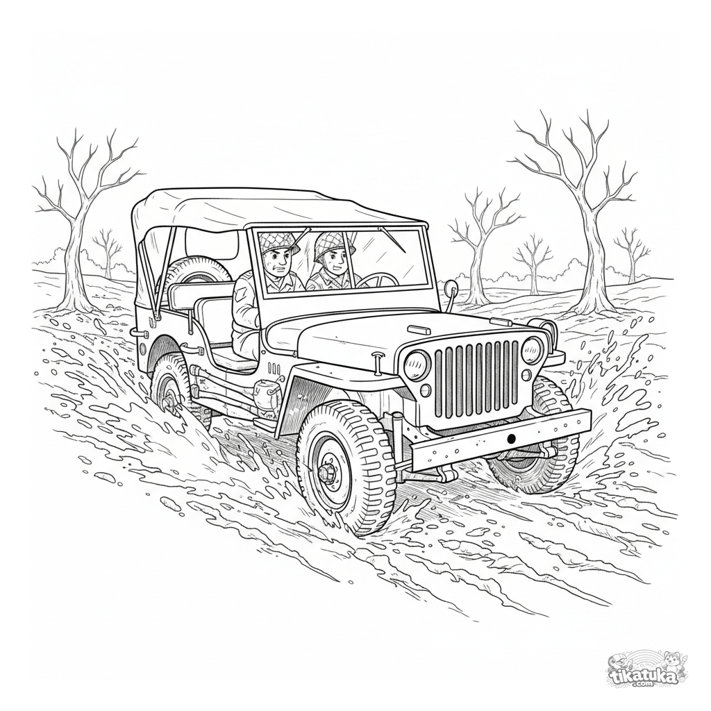 Detailed coloring page of a WWII military jeep driving through a muddy field. For boys 7-12 years old. Features mud splashes, a spare tire, and a soldier driver.