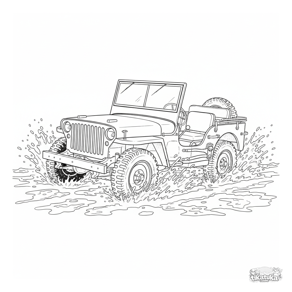 Coloring page for boys 7-12: a detailed WWII-era military jeep drives through a muddy field. High difficulty, realistic details.