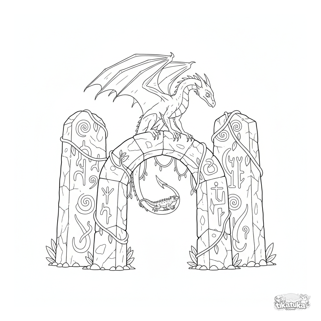 Coloring page for tweens 7-9: an agile wyvern perches on an ancient runed archway between monoliths, watching a lizard below. Moderate detail on architecture and creature.