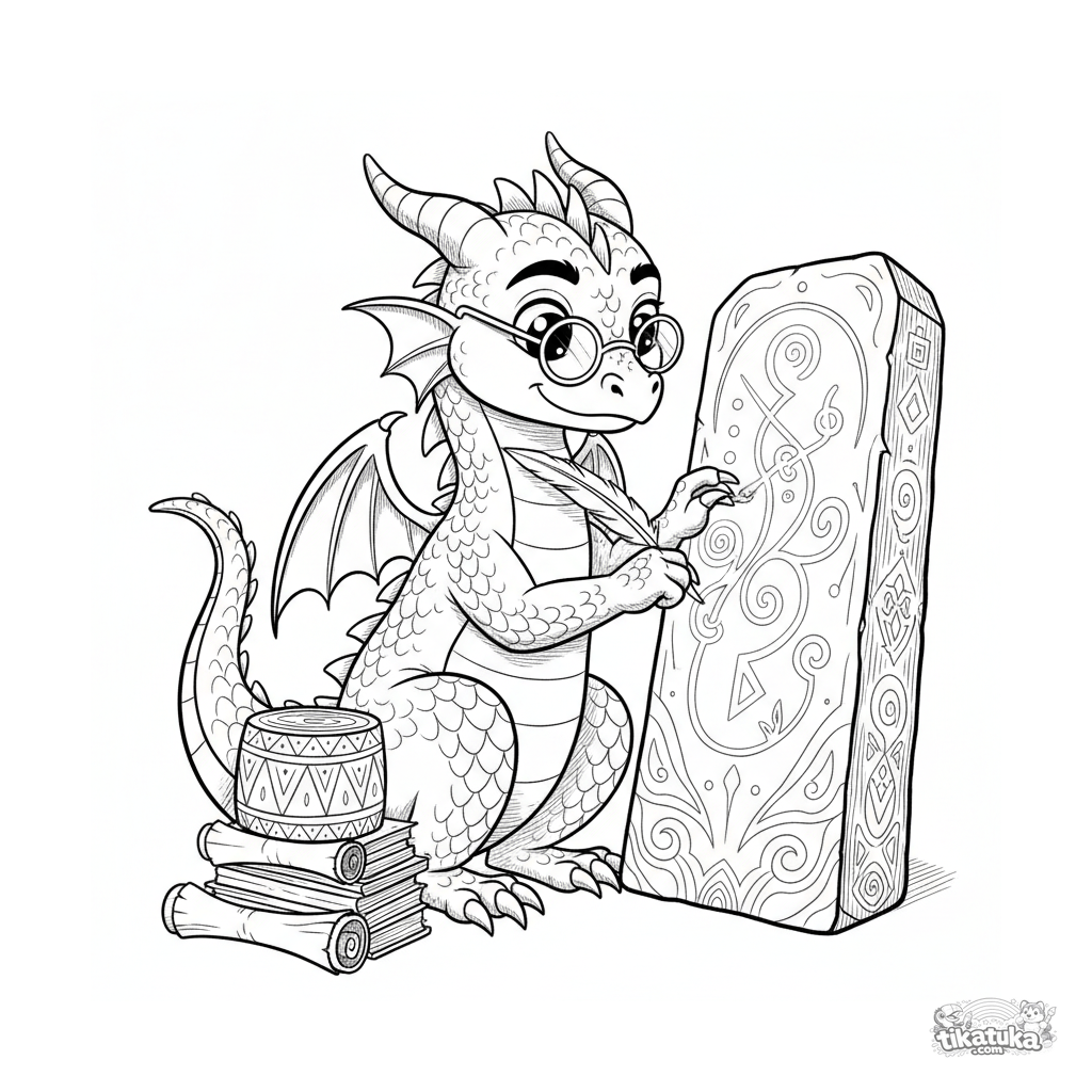 Detailed coloring page for older kids 10-12: a scholarly wyvern wearing spectacles carefully studies and traces ancient runes on a monolith. Lots of detail, accessories, vintage engraving style.