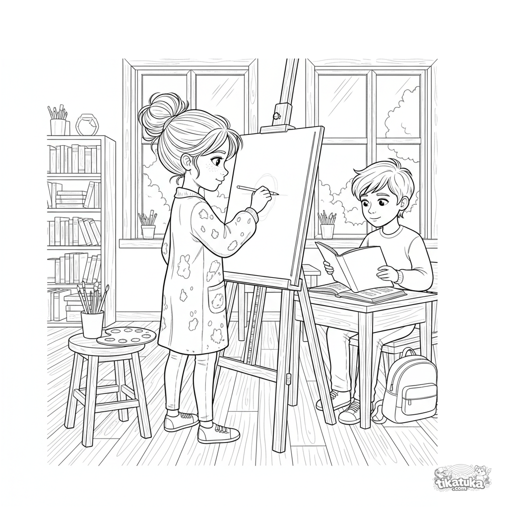 Coloring page for older kids 10-12: a young artist in a classroom sketches a classmate's portrait at an easel. Detailed scene, art supplies, realistic proportions.