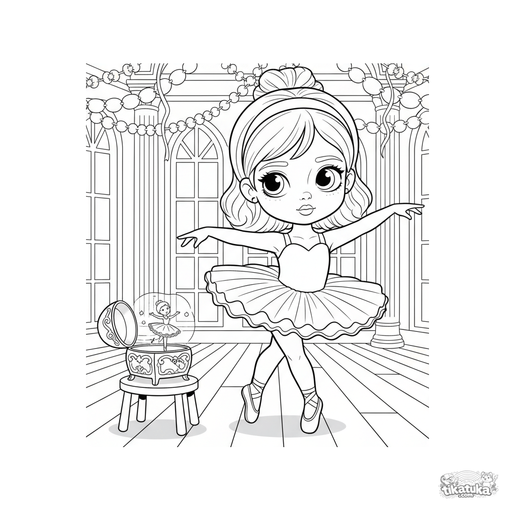 Coloring page for kids 4-6: a young ballerina in a fluffy tutu practices a pirouette in a decorated festive hall. Simple clear outlines, cute facial expression.
