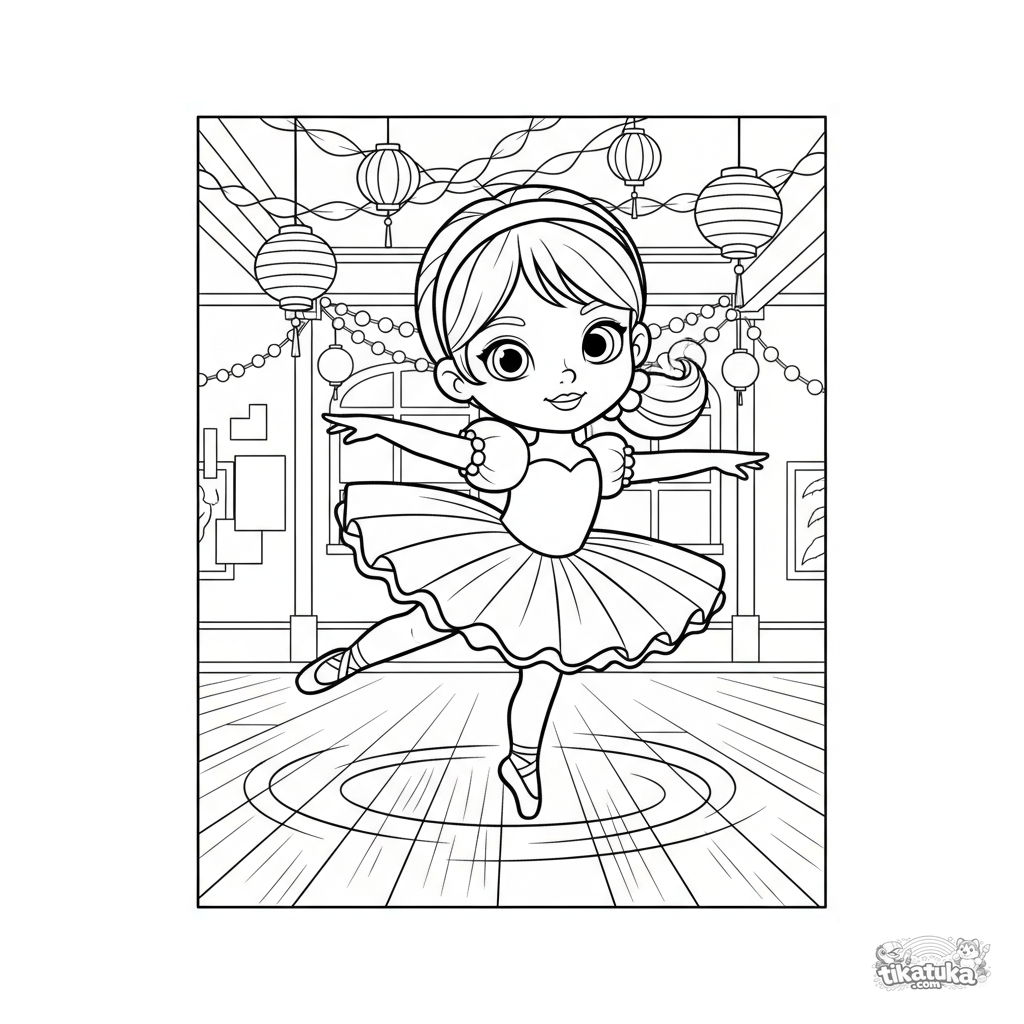 Coloring page for kids 7-9 years: a young dancer in a puffy tutu practices a spin in a festive hall decorated with garlands and lanterns.