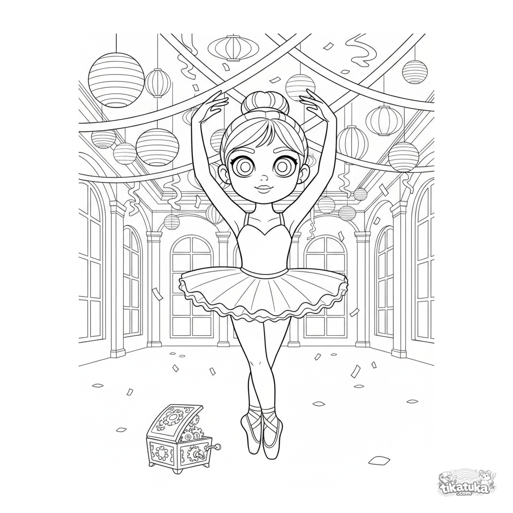 Coloring page for kids 7-9: a young ballerina practices in a decorated festive hall. Full body visible with wide white margins for coloring.