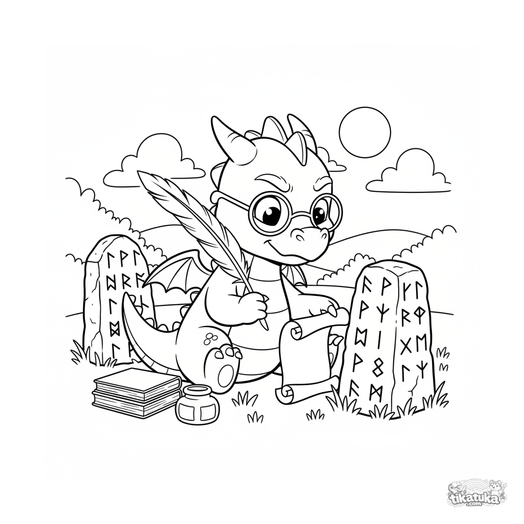 Coloring page for tweens 7-9: a young scholarly dragon with spectacles diligently copies ancient runes from a monolith onto a scroll. A scene with a historical mood.
