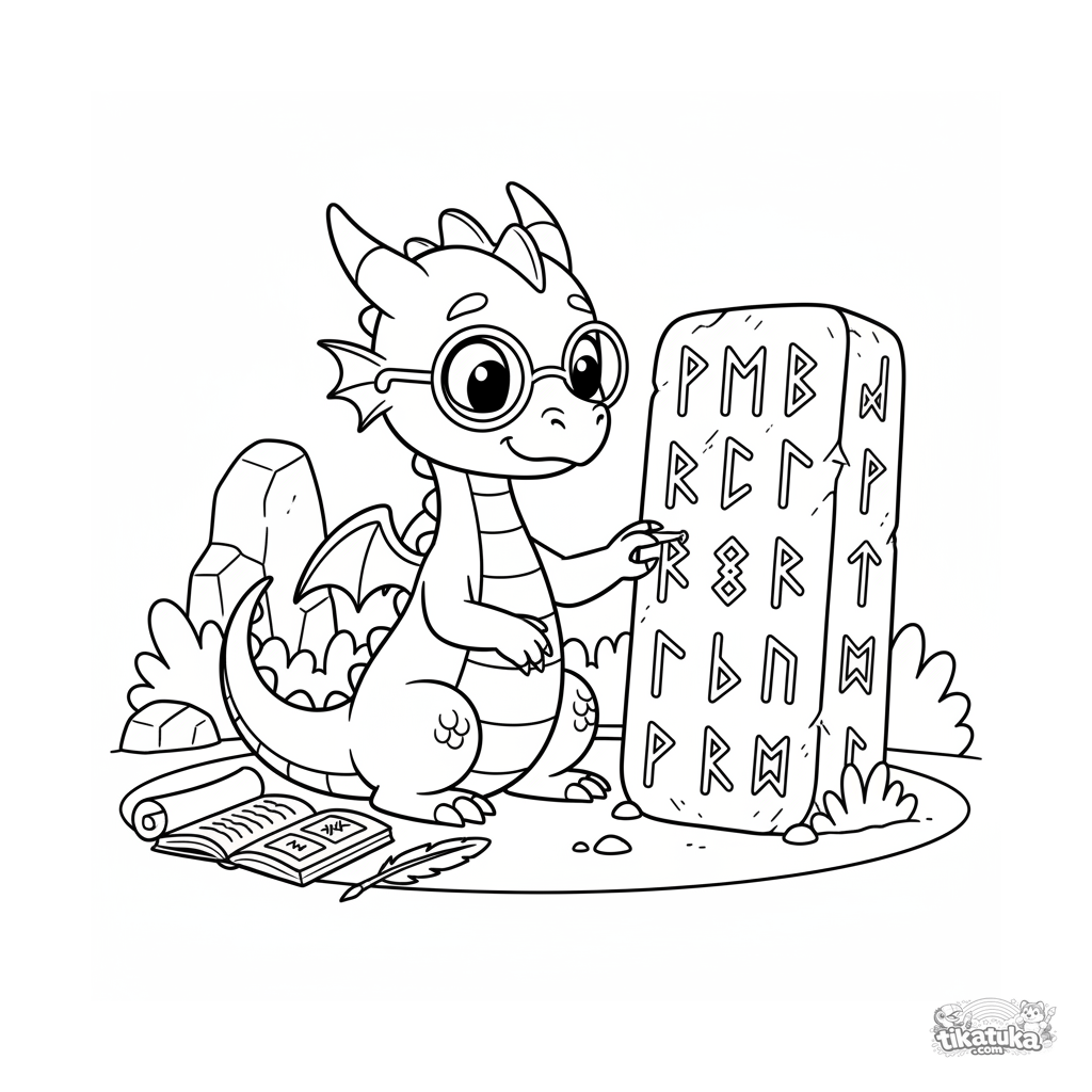 Coloring page for tweens 7-9: a young, bespectacled dragon intently studies runes on an ancient monolith. A scroll and quill nearby, a detailed scene for coloring.