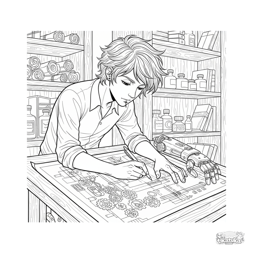 Detailed coloring page for ages 10-12: a young engineer in a secret lab sketches a complex automaton blueprint, with a mechanical arm nearby.