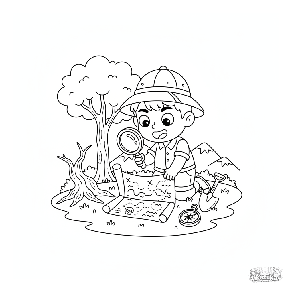 Coloring page for boys 4-6: a young explorer boy studies a treasure map with a magnifying glass. An adventure scene with clear, engaging details.
