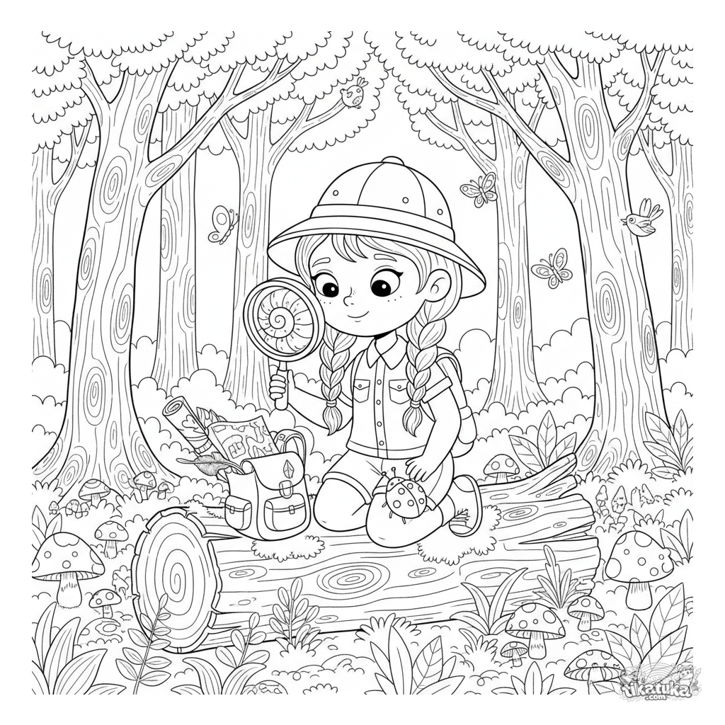 Coloring page for girls: a young explorer girl examines a snail shell with a magnifying glass in an enchanted forest. For kids aged 6-9. Lots of interesting details to color.