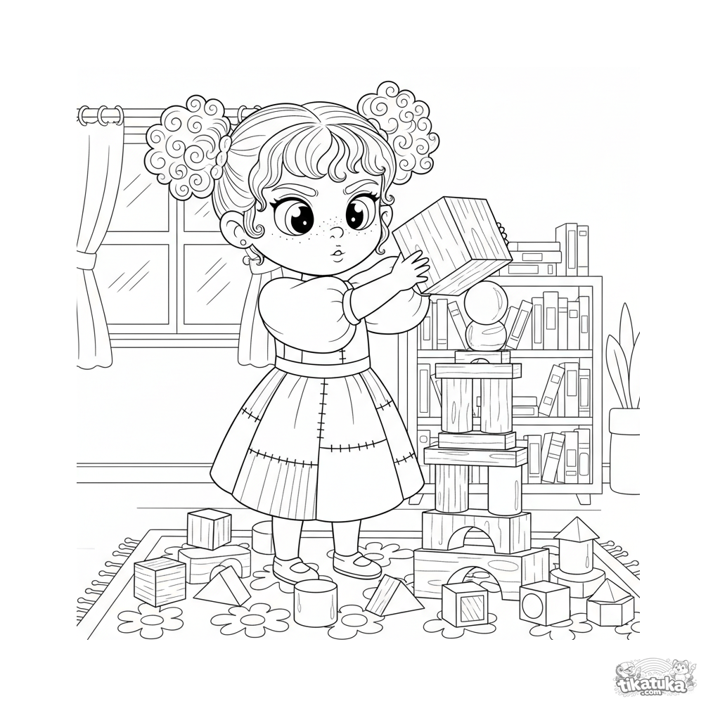 Toddler coloring page for ages 2-3: a girl in a dress builds a tall tower with big wooden blocks. Simple shapes and large details are perfect for little hands.