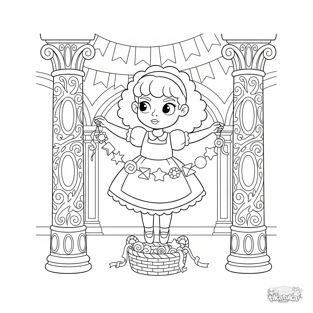 Coloring page for kids 4-6: a girl decorating a festive hall with paper garlands. A cute scene of party preparation with a basket of decorations.