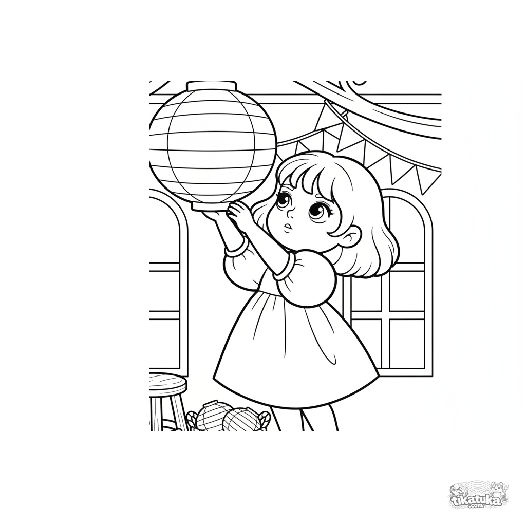 Coloring page for kids 4-6: a girl decorating a festive hall with giant paper lanterns. A cute scene of party preparation.