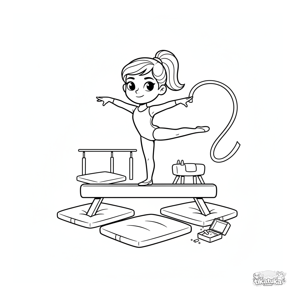 A coloring page for kids: a gymnast balances on a beam in a gym. Suitable for ages 4-6, helps develop fine motor skills and imagination.