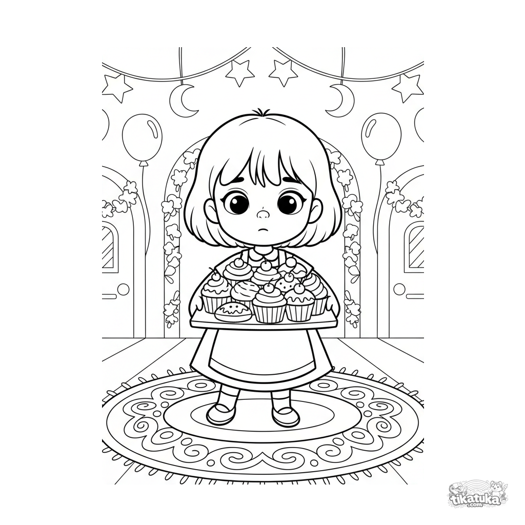 Coloring page for kids 4-6: a girl carefully carries a large tray of pastries through a decorated festive hall. A cute scene of helping at a celebration.
