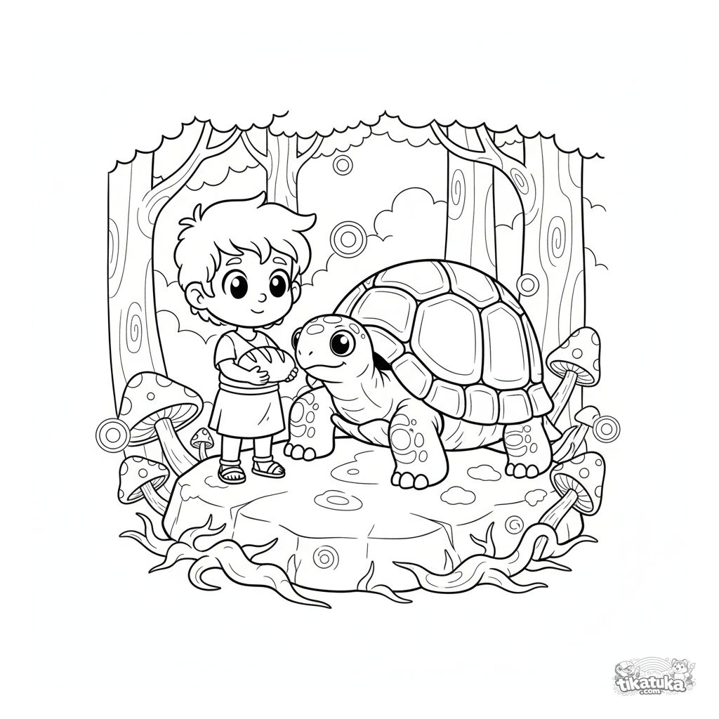 Kids coloring page: a young hero offers bread to a giant turtle guardian in an ancient forest. A scene of friendship and help from myths.