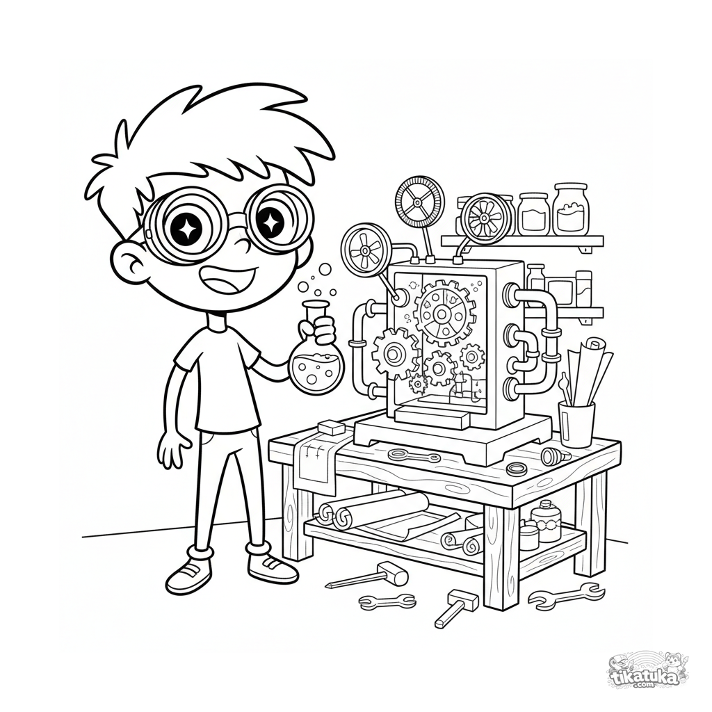 Coloring page for kids 7-9: a young inventor in a secret laboratory tests his ingenious bubble machine among blueprints and tools.