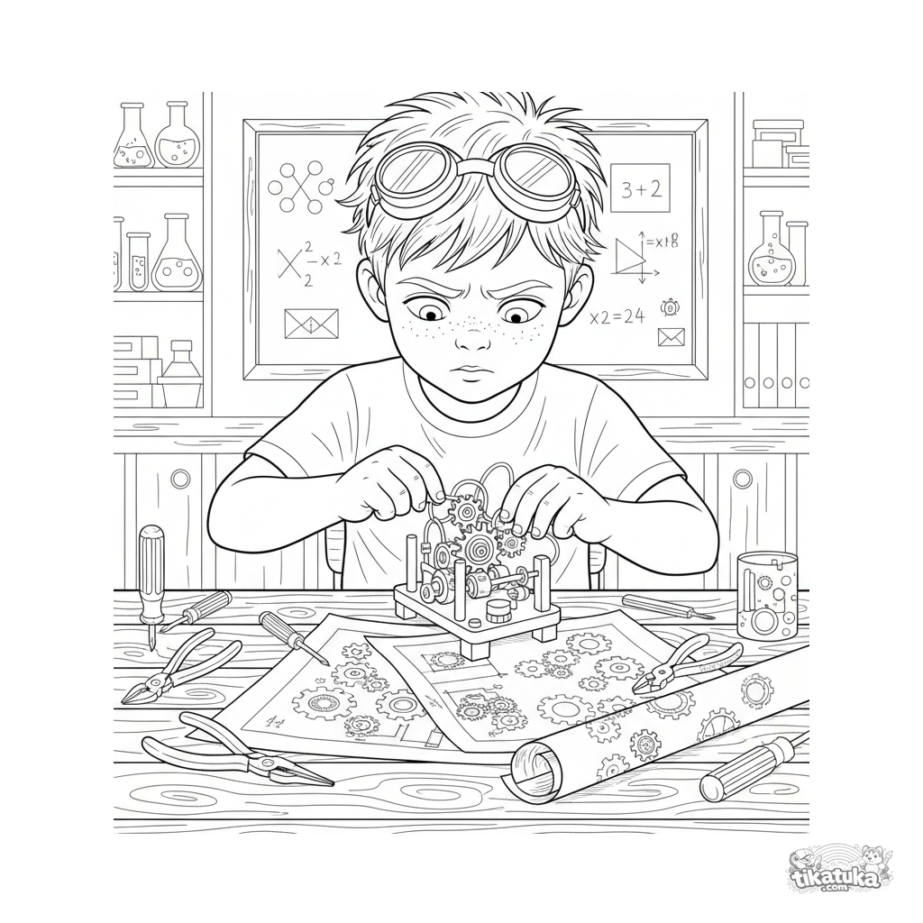 Coloring page for older kids 10-12: a young inventor tinkering with a mechanical gadget in a school classroom. A detailed science and tech scene.