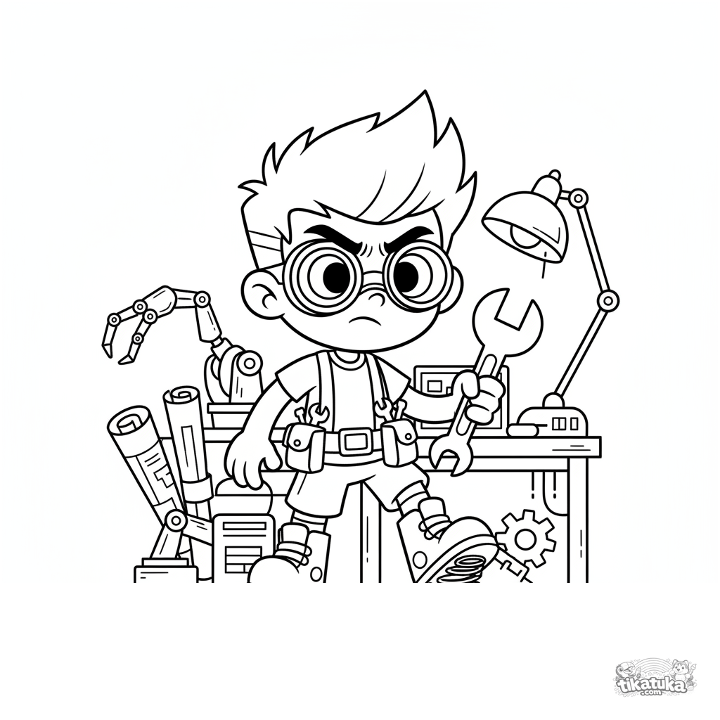 Coloring page for boys 7-9: a young inventor tests spring boots in a secret lab full of blueprints and mechanical gadgets.