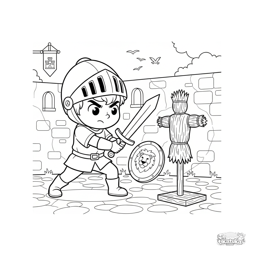 Coloring page for boys 4-6: a young knight in a big helmet practices with a wooden sword, lunging at a straw training dummy in a castle courtyard. An action scene.