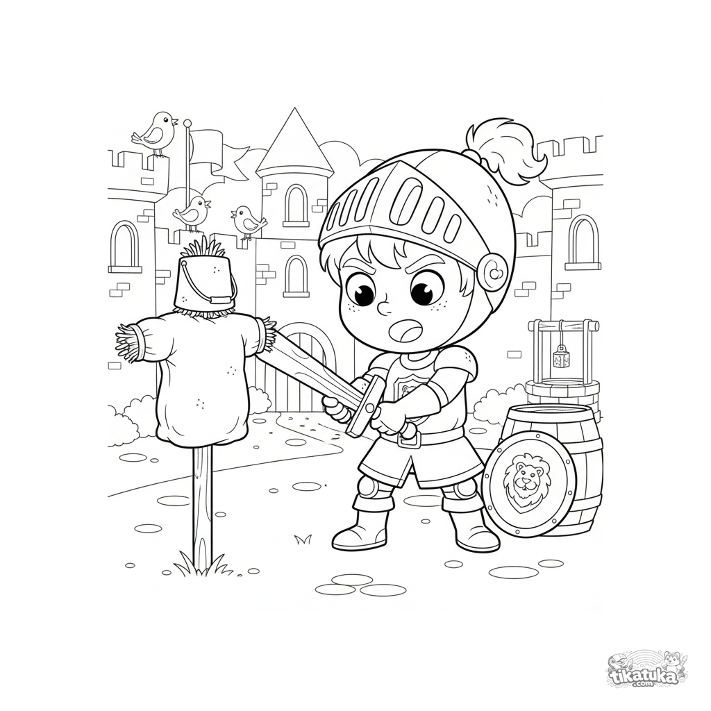Coloring page for boys 4-6: a young knight diligently trains with a wooden sword in a castle courtyard. A dynamic yet simple scene to color.