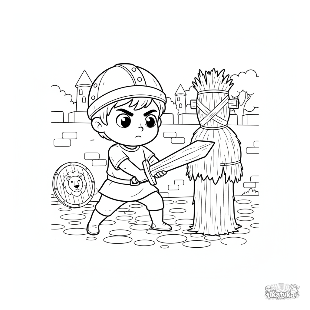 Coloring page for boys: a young knight practices with a wooden sword against a straw dummy in a castle courtyard. For kids aged 4-6.