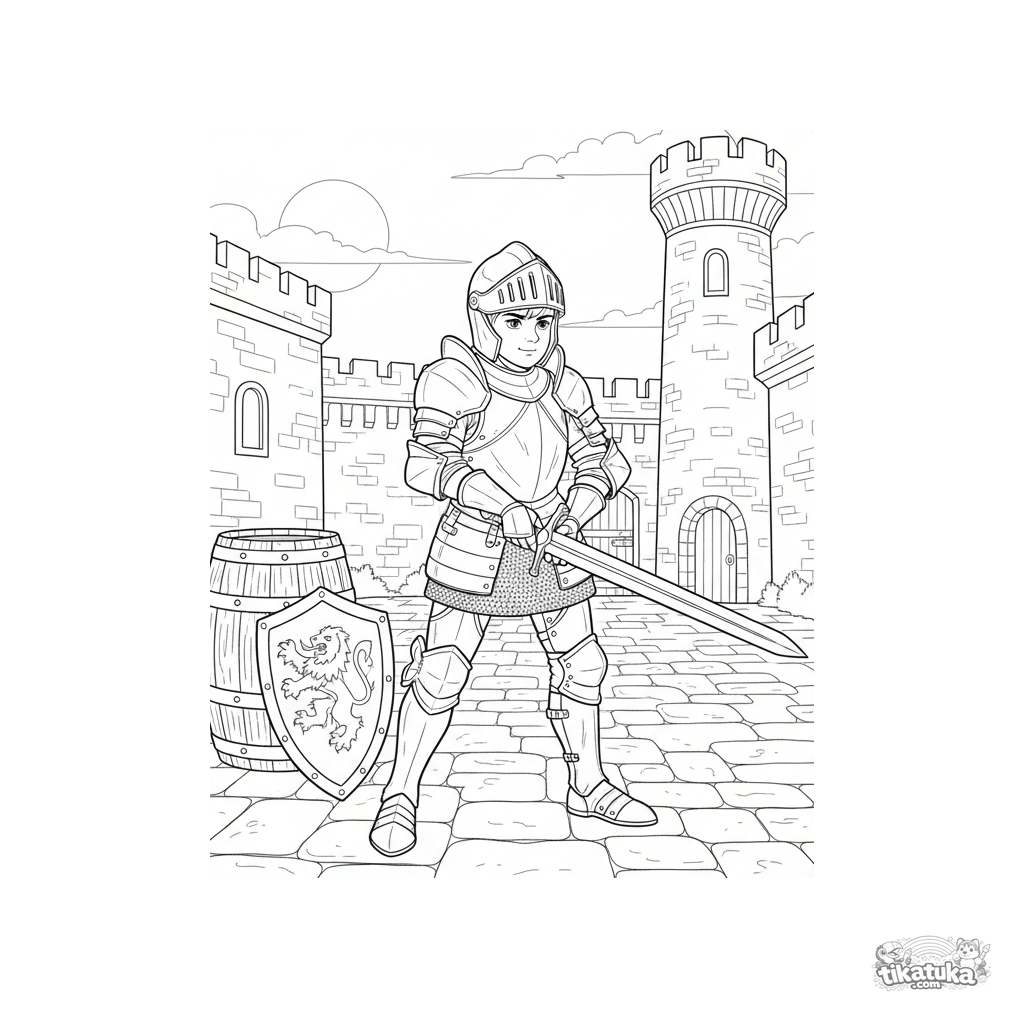 Coloring page for boys 4-6: a young knight in armor practices sword forms at dawn in a castle courtyard. Clear details of armor and weapon.