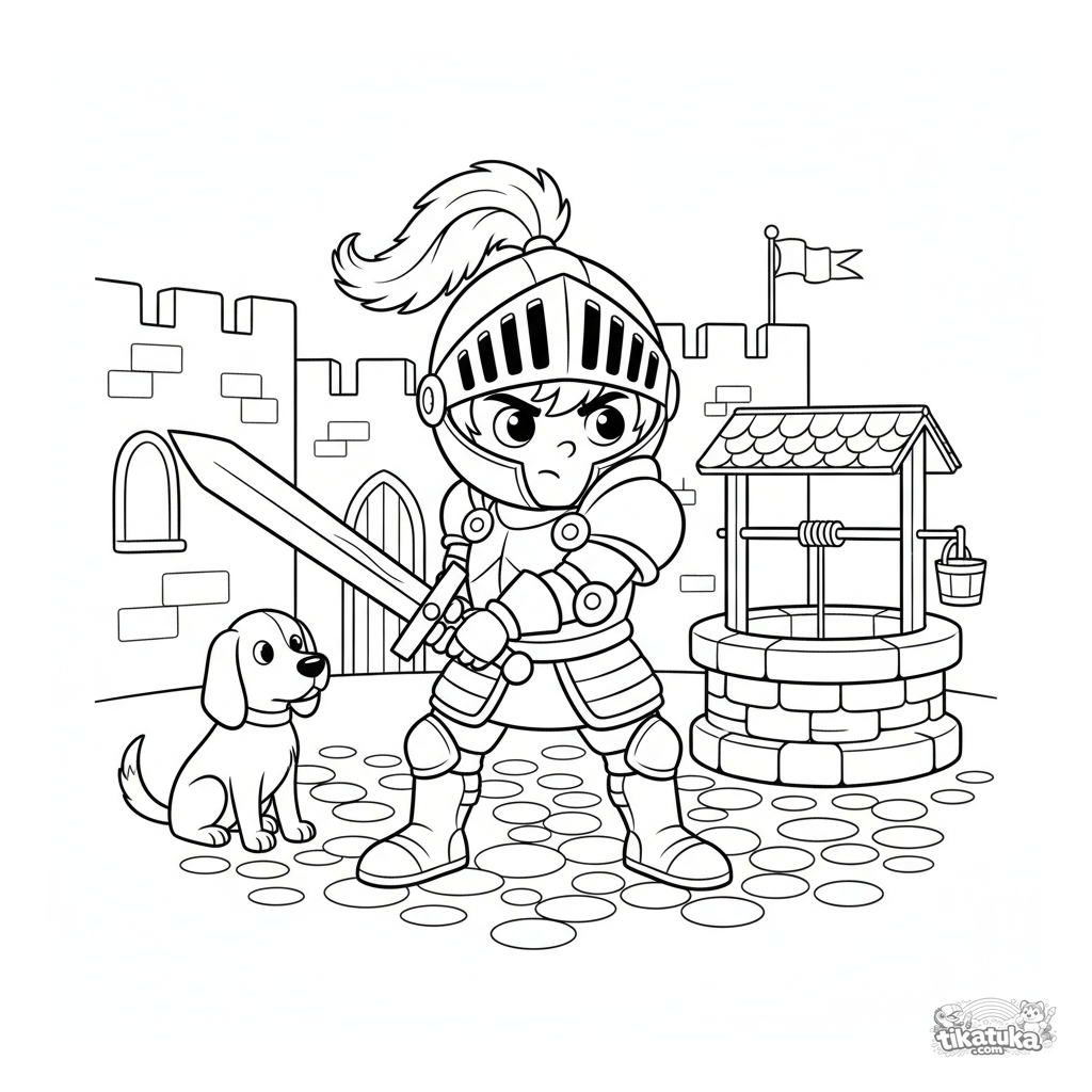 A boys' coloring page: a young knight in armor practices with a wooden sword in a castle courtyard. Clear outlines and fun details for kids ages 4-6.
