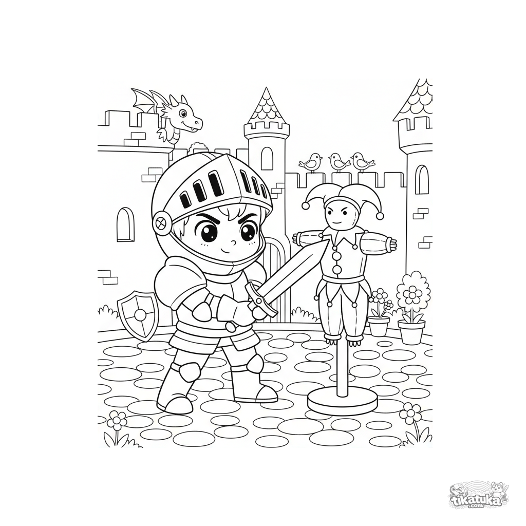 Coloring page for boys 4-6: a young knight in armor trains with a wooden sword on a practice dummy in a castle courtyard. An active, simple scene.
