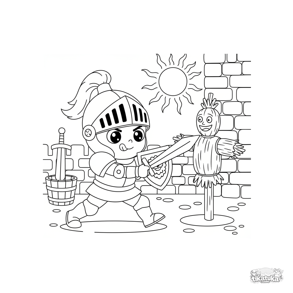 Coloring page for boys aged 5-8: a young knight trains diligently with a straw dummy in a castle courtyard. Dynamic scene with armor and a shield.