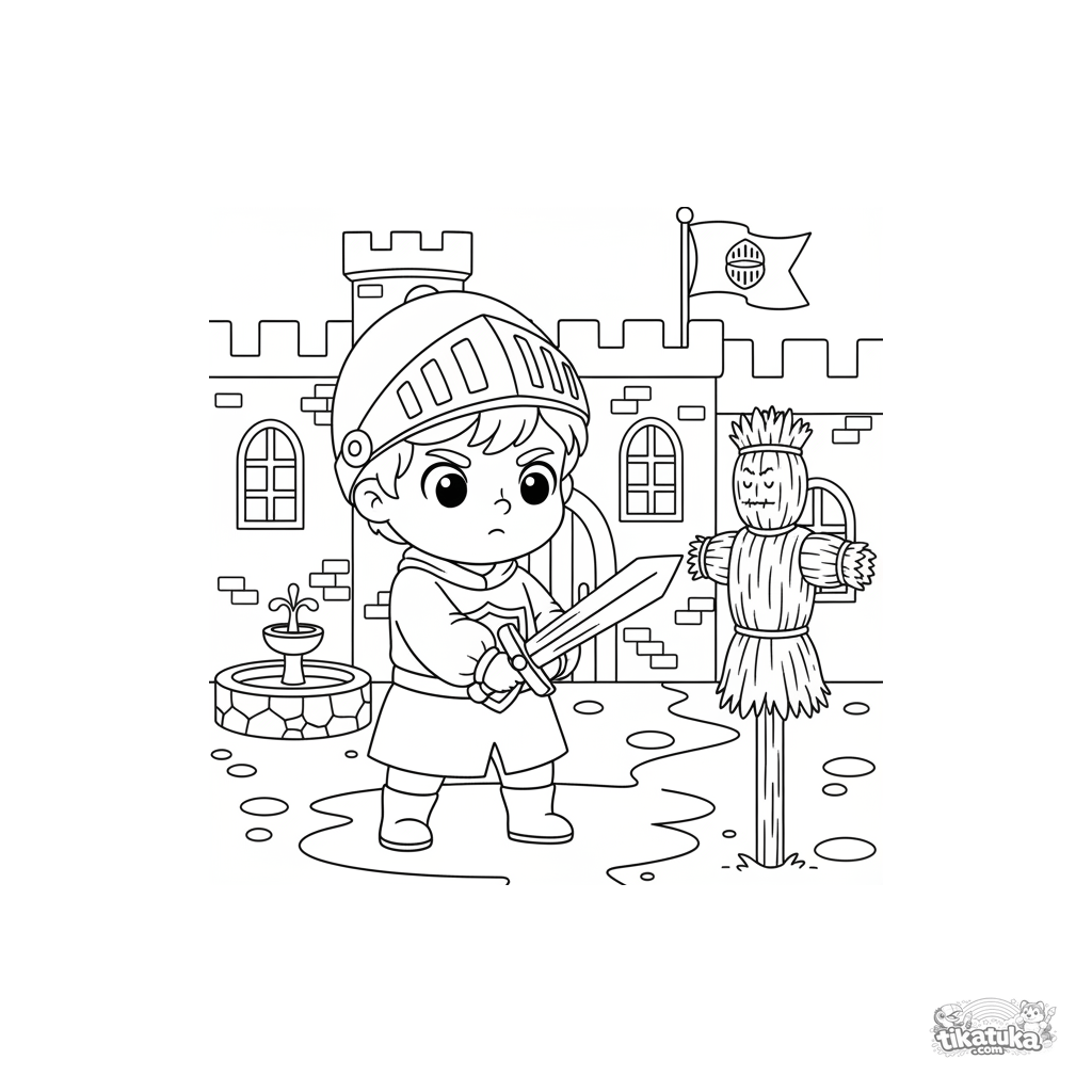 Coloring page for boys 4-6: a young knight in simple armor practices with a wooden sword on a straw dummy in a castle courtyard.