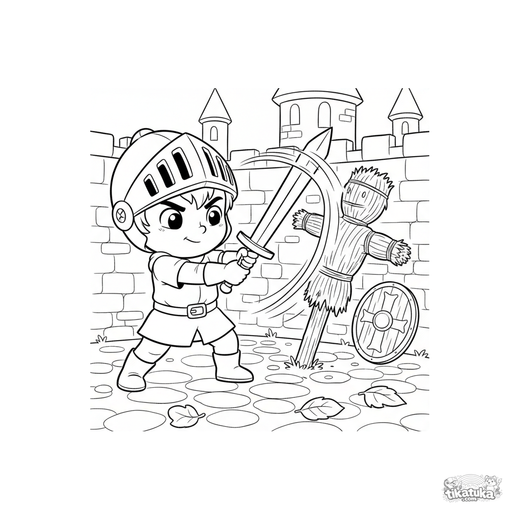 Coloring page for boys 4-6: a young knight trains with a wooden sword in a castle courtyard. An action-packed yet simple scene to color.