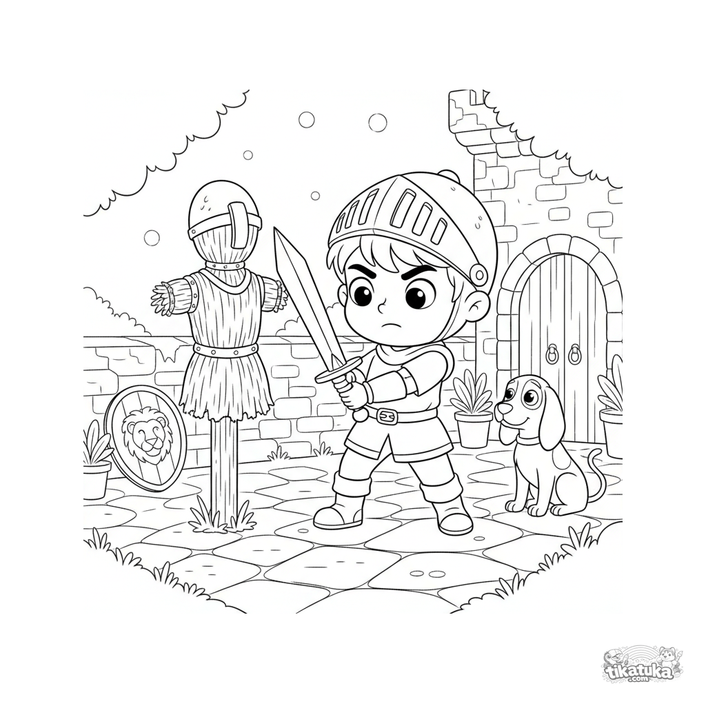 Coloring page of a young knight training with a wooden sword in a castle courtyard. For boys aged 5-8. Scene with a practice dummy and a loyal hound.
