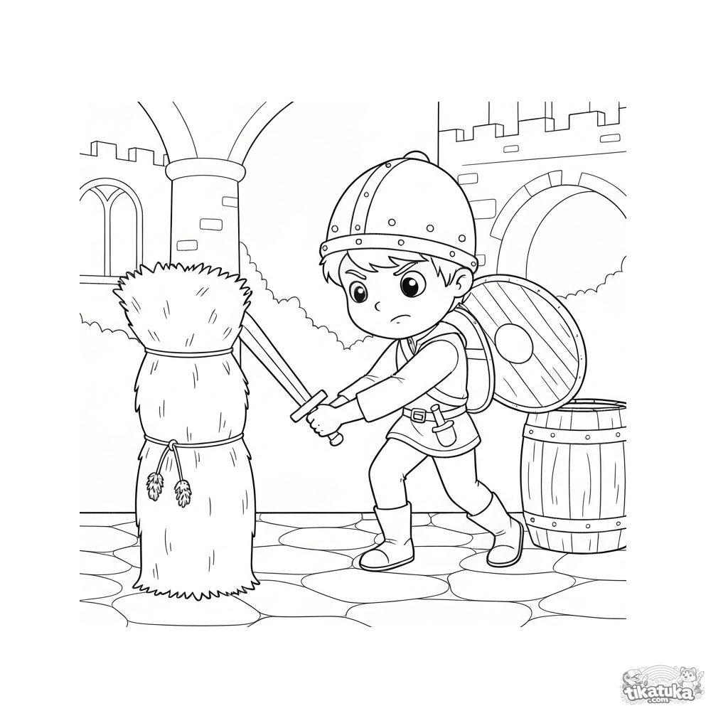 Coloring page for boys 3-6 years. A young knight in a castle courtyard practices striking a straw dummy with a wooden training sword and a shield.