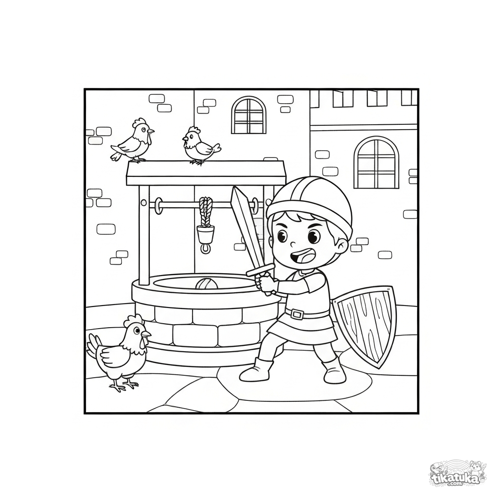 Coloring page of a young knight practicing with a wooden sword at a stone well. For toddlers aged 2-5. Simple scene with a chicken and a shield.